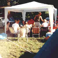 Ab um zwei war Anreise angesagt. Wir trafen uns in Naumburg auf dem Zeltplatz, bauten unsere Zelte auf und gingen zum Wasser. Dies waren unsere ersten Übungen mit dem Canadier (so heißt unser Gefährt auf dem Wasser). Unser Paddellehrer teilte uns einige Tricks und wichtige Paddeleigenschaften mit ( Breitschlag u.s.w. was auch immer das ist !!). Und nun gings ins Kanu. Und wir drehten einige runden auf dem Wasser. Das wichtigste wußten wir dann auch und waren sozusagen gut ( andere weniger gut ) gerüstet für den morgigen Tag. So glaubten wir zumindestens. Als wir von unseren Übungen zurückkehrten haben wir Würstchen gegrillt und lecker gegessen. Dann saßen wir noch unter unseren großen Pavillon und unterhielten uns. So nach und nach gingen dann alle zu Bett um morgen fit zu sein.